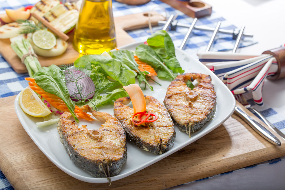 Minekop balığı, halka halka ızgarada kızartılır roka, kıvırcık, soğan ve limon eşliğinde servis edilir.