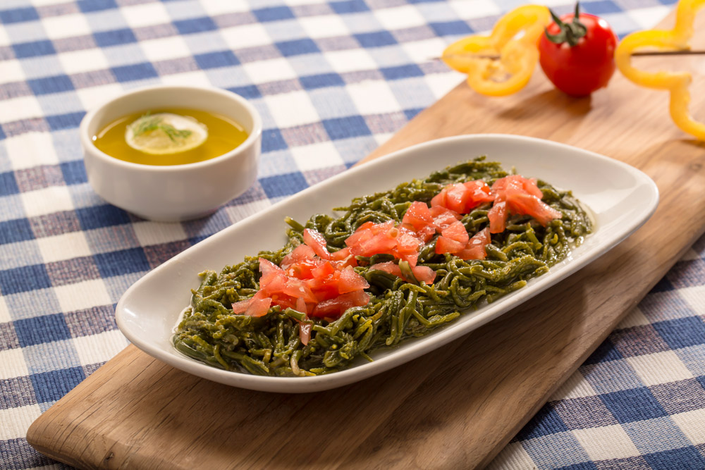 Haşlanmış deniz börülcesi, domates, sarımsak sosu ve zeytinyağı ile servis edilir.
