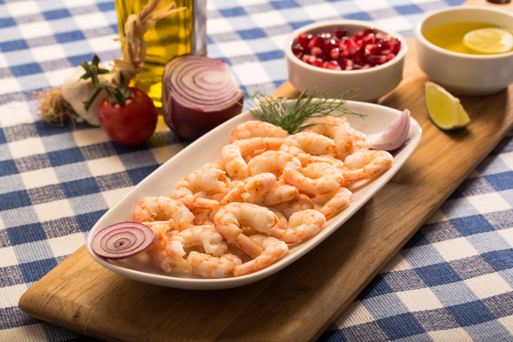 Haşlanmış karideş, yeşillikler üzerinde zeytinyağı ve limon sosu eklenerek servis edilir.