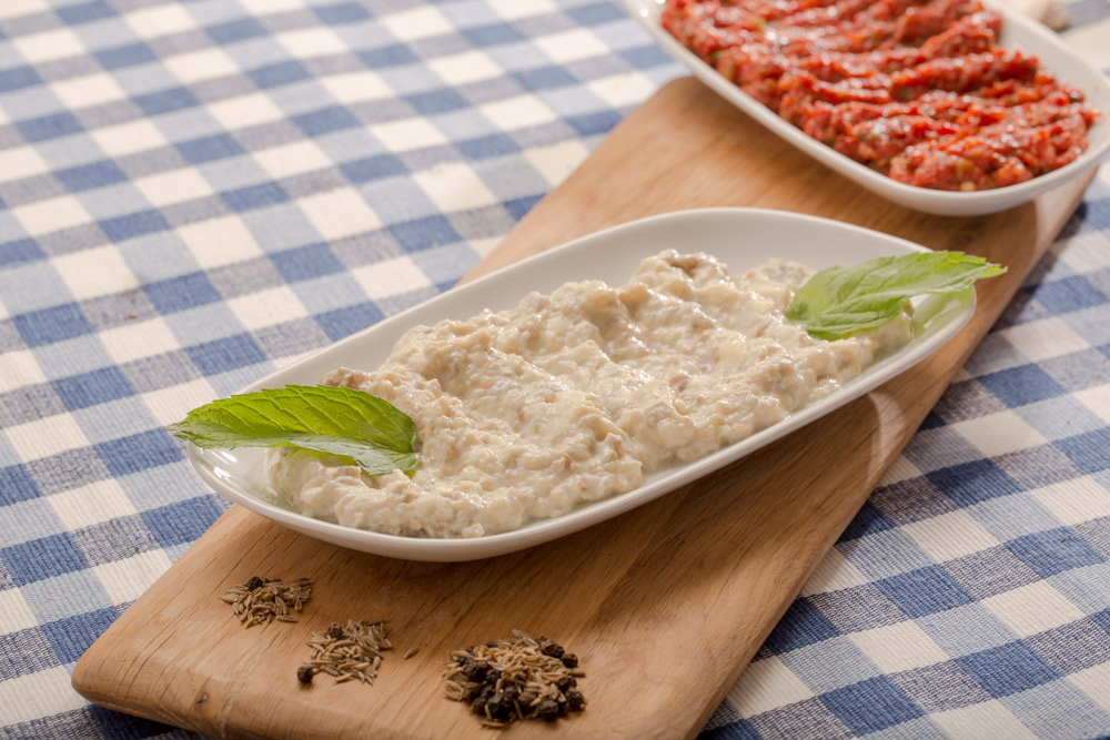 Közlenmiş patlıcanlar sarımsak, zeytinyağı, limon ve yoğurt ile terbiye edilerek servis edilir.