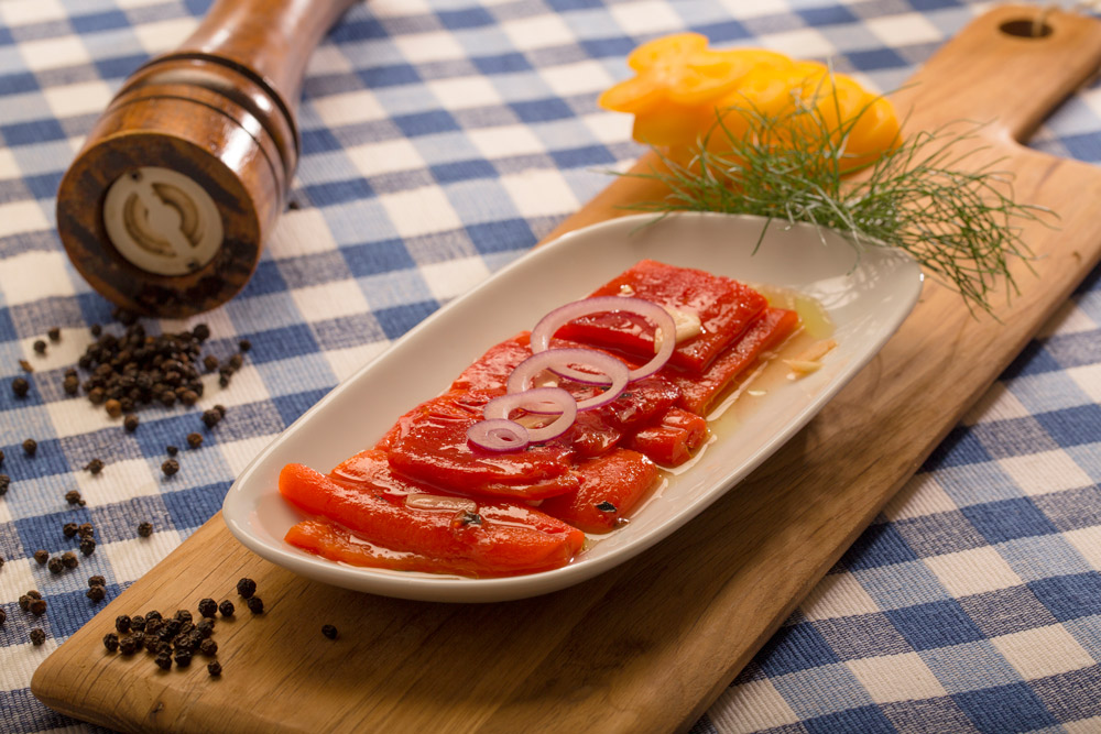 Izgarada közlenmiş kapya biberi sarımsak ve zeytinyağı ile soslanarak servis edilir.
